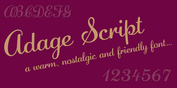 Adage Script is a classy script typeface that is warm, feminine, sturdy and dependable. This digital revival has been another popular seller from Jukebox! It's perfect for a variety of projects from scrapbooking to product design and menus. Adage Script evokes that sense of well being in life's happy moments.