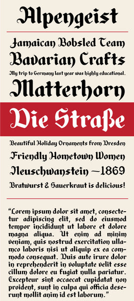 Alpengeist is a Blackletter style font whose name literally means "Spirit of the Alps" in German. This typeface, based on a hand lettered sign, inspires the biergarten lover in all of us. Packed with European and Germanic flair, this whimsical take on the Blackletter style will add old world charm to your project or design.
