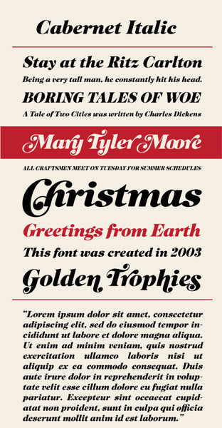 Cabernet is a classic "Caslon" style swash font family with heavy contrast between thick and thin. It is a digital revival of two photo-typositing faces from the 1960s. The swash variants add charm and some retro whimsy to this typeface, particularly in the Italic face. I just love all the 1960s swashiness!
