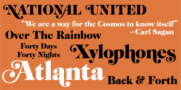Cabernet Regular is a classic "Caslon" style swash font with heavy contrast between thick and thin. It is a digital revival of an old photo-typositing face from the 1960s. The swash variants add charm and some retro whimsy to this typeface, widely recognized as the "Foxy Brown" font, from the 1974 film.