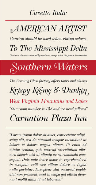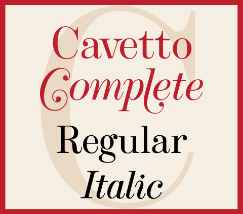 Cavetto is a serif font family I designed to add a classic text face to the Jukebox library, consisting of Cavetto Regular and Cavetto Italic. The Cavetto family is designed in the tradition of Bodoni style (a.k.a. "Modern") fonts, with strong contrast between thick and thin and vertical axis stress. This font is a great choice for a more refined and elegant appearance where only the traditional will do.