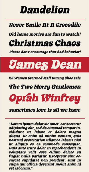 Dandelion is a delightful and fun font, digitally revived from an older photo-typositing face. Perfect for a variety of uses, it is filled with 60s and 70s charm and has a child-like quality to it.