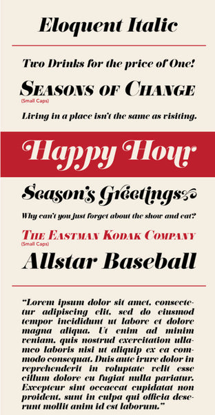 Eloquent is an award-winning* display & serif family digitally revived from a font called Pistilli Roman. The original Pistilli Roman font is a gorgeous "Didone" style typeface designed in the 1960s that never made it into digital form. I expanded the original single weight to include italic and small caps. This package contains Eloquent Regular, Eloquent Small Caps, Eloquent Italic and Eloquent Small Caps Italic and, all of which have a full set of Swash alternates as well as oldstyle numerals and other alternates to round out the functionality. You also get the Eloquent Caption Weight with this set as well, which can be used for smaller point sizes. The heavy contrast between thick and thin is what gives Eloquent its unique look. This has been one of my most popular typefaces since it was released in 2009.