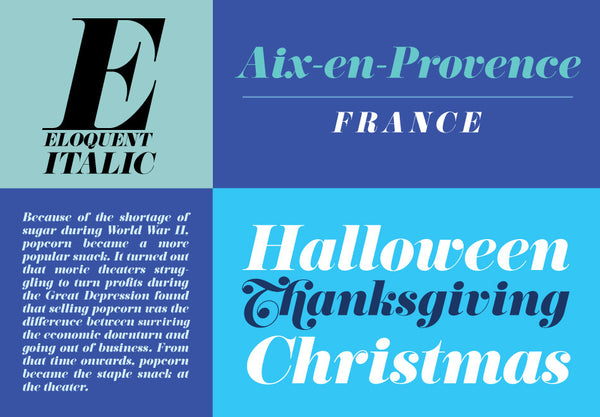 Eloquent is an award-winning* display & serif family digitally revived from a font called Pistilli Roman. The original Pistilli Roman font is a gorgeous "Didone" style typeface designed in the 1960s that never made it into digital form. I expanded the original single weight to include italic and small caps. All Eloquent weights have a full set of Swash alternates as well as oldstyle numerals and other alternates to round out the functionality. The heavy contrast between thick and thin is what gives Eloquent its unique look. This has been one of my most popular typefaces since it was released in 2009.