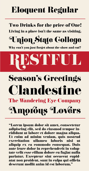 Eloquent is an award-winning* display & serif family digitally revived from a font called Pistilli Roman. The original Pistilli Roman font is a gorgeous "Didone" style typeface designed in the 1960s that never made it into digital form. I expanded the original single weight to include italic and small caps. All Eloquent weights have a full set of Swash alternates as well as oldstyle numerals and other alternates to round out the functionality. The heavy contrast between thick and thin is what gives Eloquent its unique look. This has been one of my most popular typefaces since it was released in 2009.