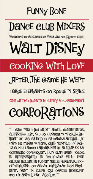 Funny Bone will tickle your ulnar nerve with its fun and child-like exuberance! A digital revival of an older photo-typositing face, Funny Bone makes use of size variations and a modulated baseline to wield its charm. Perfect for any light hearted design or for anyone who's a kid at heart!