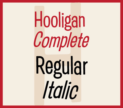 Hooligan Complete contains two fonts: Hooligan Regular and Hooligan Italic. The package price for both saves you more than 15% off the individual price.