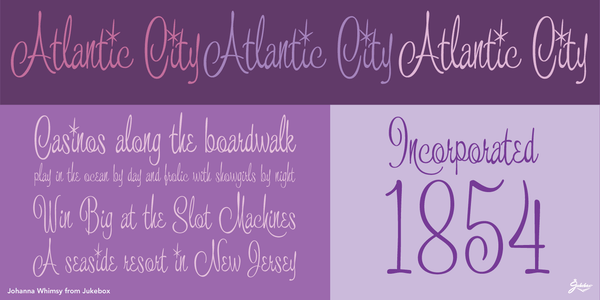 Johanna Whimsy is a fun light-hearted script font that is named after a friend of mine who is a well-known folk artist. The design was inspired by a hand lettered sample from the 1960s. The font features alternate versions of the h, i, n and m for some typographic variety. The typeface exudes delight and happiness and is perfect for a variety of projects!