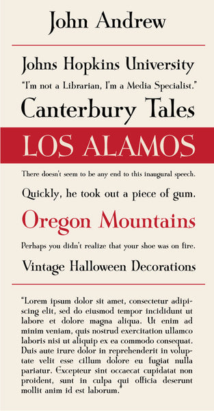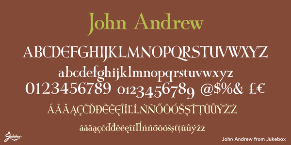 John Andrew is a serif font that has some hand drawn and uncial influences. Inspired by a hand lettered sample in an old "how to" book on calligraphy, John Andrew is named for the designer's father. The font has an elegance and grace to it that makes it a fantastic choice for a display face. Yet, it still retains a warmth that makes it very approachable.