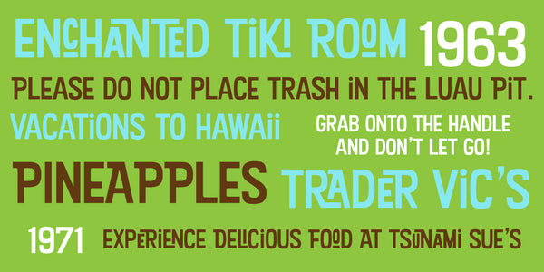 Notable Use: Kon Tiki Aloha was used by Disneyland for the signage for their exhibition on the 50th Anniversary of the "Enchanted Tiki Room" attraction.