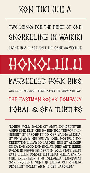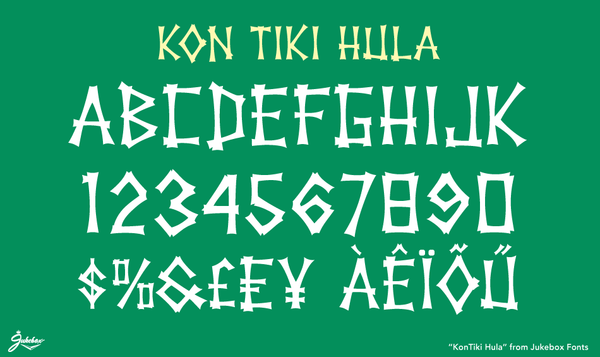 Kon Tiki Hula is a playful Tiki Hut, bamboo style font that is part of the KonTiki Collection: a series of seven related fonts I designed to celebrate the retro mid-century style of Hawaiian kitsch. Kon Tiki Hula has that classic "formed from bamboo" look that will make anyone crave a Mai-Tai and relaxing at the beach on Waikiki.