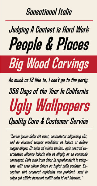 Sansational is a sans serif font family I designed to help round out the Jukebox library with something that can be used both for text and display. The typeface is designed in the tradition of the sans serif typefaces popular in the era of photo-typositing. A great workhorse sans serif family, Sansational is versatile and attractive. Sansational Italic is a more of a "true" italic rather than just a slanted version of the regular face.