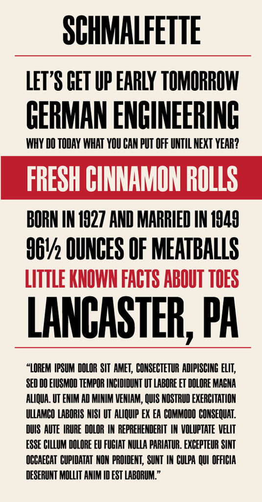 Schmalfette is the result of another collaboration between designers Jason Walcott and Rob King. King suggested that Walcott revive this wonderful sans-serif typeface from the mid 1950s. Originally designed by Walter Haettenschweiler in 1954, Schmalfette Grotesk was used for many years in the German magazine "Twen". The typeface was notoriously hard to acquire at the time and graphic designers in the USA often resorted to cutting letters from the Twen magazines and reusing them in their own designs. At Rob King's suggestion, Jason Walcott has strived to recreate the most faithful digital revival possible of the original Schmalfette Grotesk so anyone who has ever searched for this typeface now has a version available that most closely resembles Haettenschweiler's original work.