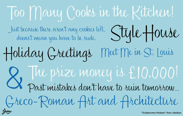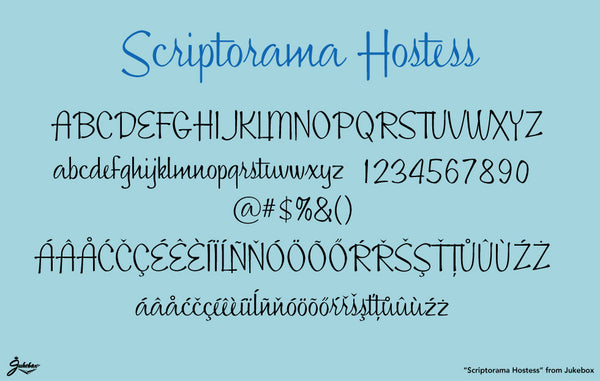 Scriptorama Hostess is a fun and elegant script font from Jukebox based on a hand-lettered logotype from the 1960s. Full of mid-century modern charm, this retro style font will add a touch of flair to any design… It harkens back to the days of martinis and starburst clocks!