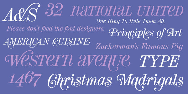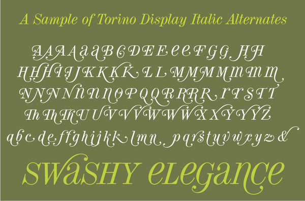 Torino Display Italic is another one of my personal favorites! Digitally revived from an older photo-typositing face, this typeface has a ton of alternate and swash variants to give it a wide range of typographic possibilities. Some of the most interesting are the capital-sized versions of the lowercase a, e, n and r, each with their own swash alternates as well. This is a terrific font for display use and combines the best of both script and serif design elements.