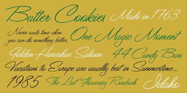Valentina Joy is another one of the most popular Jukebox fonts in the collection. It is a dynamic and flowing script font that is a "semi" digital revival. The design is partially based on an older photo-typositing font that I have seen used*, but I never could find the name or a full type specimen of the mysterious original. Starting with the letters I had, (about 1/2 the alphabet) I filled in the rest with characters of my own design to match. It has ultimately become its own design and yet retains the feeling of the original. The relatively small x-height gives it a unique look.