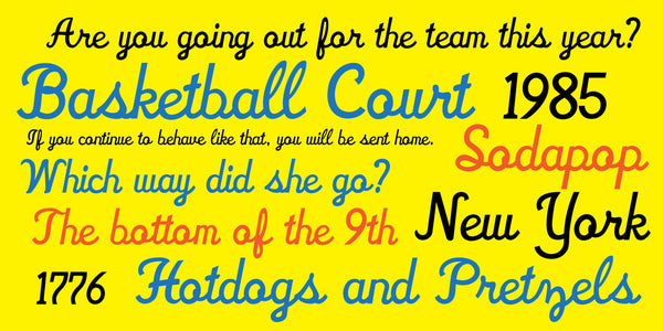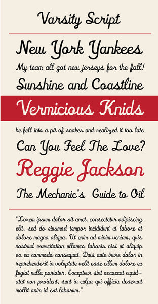 Varsity Script is a very early Jukebox font that is designed in the style of the athletic scripts commonly found on team jerseys and uniforms. Unassuming and charming, this font is perfect for a number of applications where a light hearted, easy going feeling is needed.