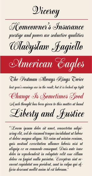 Viceroy is a digital revival of an older photo-typositing face. An elegant script font with non-connecting lowercase letters that resemble an italic face. Viceroy speaks of formal occasions, weddings, gala balls, invitations and fancy dinners. A high class typeface for a number of design applications.